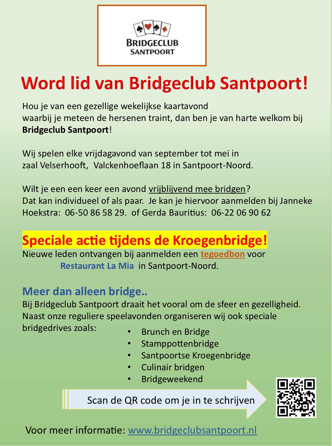 De Santpoortse Kroegenbridge is een gezellige bridgedrive die plaatsvindt in 7 verschillende horeca gelegenheden in de karakteristieke dorpskern van Santpoort-Noord. Een unieke kans om je bridgevaardigheden te combineren met de gemoedelijke sfeer van de lokale Santpoortse horeca. De gastheren en gastvrouwen staan voor u klaar om u te ontvangen.